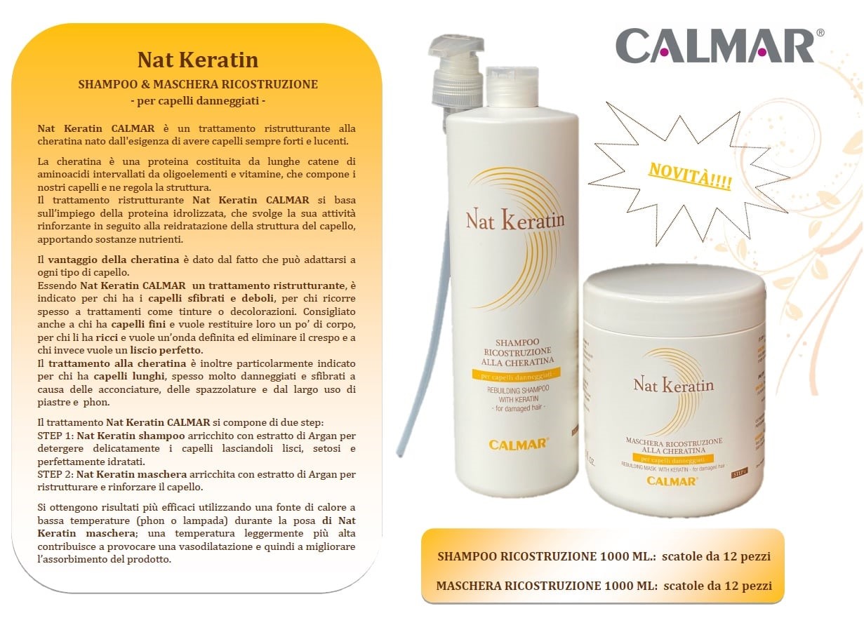 Calmar Nat Keratin - szampon restrukturyzujący i rewitalizujący z dużą ilością keratyny i olejku arganowego. Nadaje włosom objętości, miękkości i blasku. Sposób użycia: nanieść na mokre włosy, wmasować i dokładnie spłukać, w razie potrzeby czynność powtórzyć. Zaleca się stosowanie w połączeniu z maską z tej samej serii. Poj. 1000ml